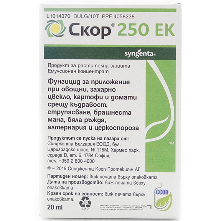 Скор 250 ЕК е системен фунгицид с предпазно и лечебно действие. Има широк спектър на действие при различни култури.